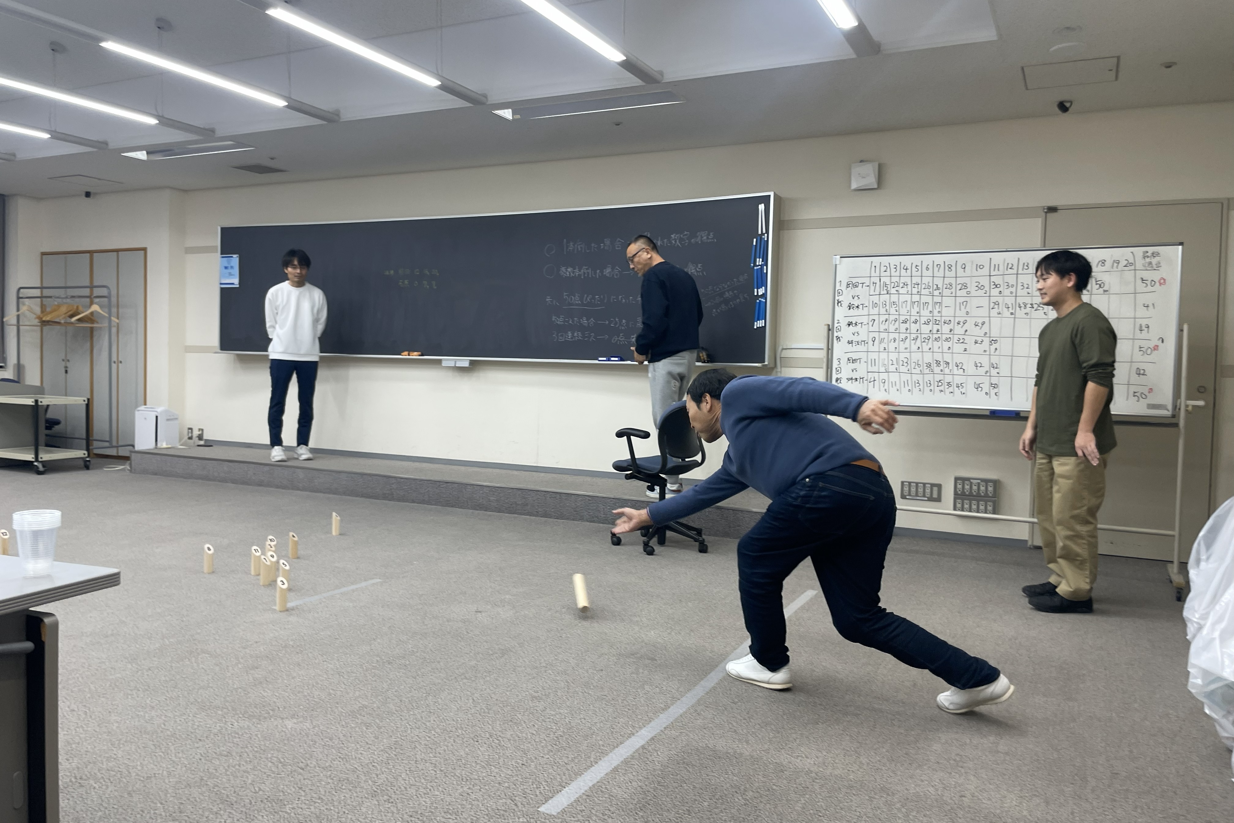 数字の書かれた木のピンを、木のスティックを投げて倒すゲームです。ルールが色々と細かくあってシンプルですがハマる社員続出でした(笑)